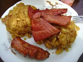 El mofongo es un plato típico de Puerto Rico.[17][18] con plátanos fritos como ingrediente principal. Los plátanos se cosechan verdes y se fríen, luego se machacan con sal, ajo, caldo y aceite de oliva en un pilón de madera (un mortero de madera de Caoba o guayacán). El objetivo es producir una bola compacta de puré de plátanos que absorberá los condimentos que lo acompañan y que contenga chicharrón o trozos de tocino en su interior. Se sirve tradicionalmente con carne frita y caldo de pollo. Los sabores particulares resultan de variaciones que incluyen verduras, pollo, camarones, carne de res o pulpo empacados dentro o alrededor del orbe de plátano.