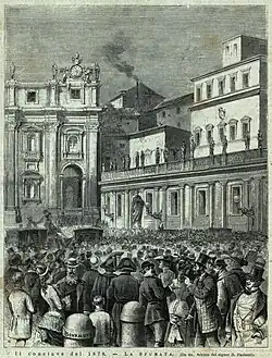 La tradición se remonta al año 1800, cuando el pueblo de Roma se reunió frente al Quirinal para presenciar el humo que se producía al quemar las papeletas de los cardenales.[3] A diferencia de hoy, la fumata indicaba el fracaso en la elección del pontífice, mientras que su ausencia indicaba una elección exitosa.[3][4][5] Incluso en el cónclave de 1903 no hubo distinción en el color de la fumata (también llamada sfumata), que se producía quemando las papeletas de los cardenales electores mezcladas con paja en una estufa colocada en la Sala Regia.[6] La fumata de las elecciones fallidas era blanco o negruzco,[7] mientras que en la mañana de la elección de Pío X no hubo humo en absoluto.[8][9] El primer uso de la fumata blanca para marcar una elección exitosa y de la fumata negra para una elección fallida se remonta al cónclave de 1914, que finalizó con la elección de Benedicto XV.[9]