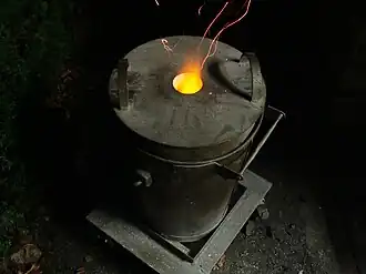 Los primeros procesos siderúrgicos realizados en Eurasia y África realizaban la fundición en pequeños hornos troncocónicos, donde la temperatura no era lo suficientemente alta para que el hierro se fundiera. Así se producía una masa blanda de hierro incandescente a la que podía darse forma forjándolo a martillazos. Las primeros hallazgos arqueológicos de esta técnica se han encontrado en Tell Hammeh, Jordania, datadas con carbono 14 alrededor del 930 a. C.[17]