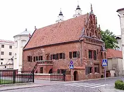 - Casa de Perkunas,[17] de mediados del siglo XV. Era edificio comercial de la Liga Hanseática, y mantuvo tal función hasta 1532. Posteriormente se utilizó por la Compañía de Jesús. Su nombre actual deriva de una pequeña imagen encontrada en su muro, que los historiadores románticos consideraron que representaba al dios báltico del trueno.[18]