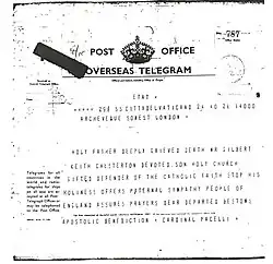 Telegrama de condolencias enviado por el cardenal Eugenio Pacelli, futuro Pío XII, en nombre del papa Pío XI.
