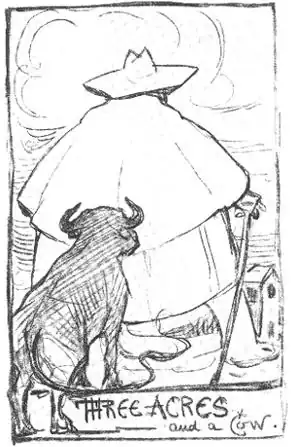 Autorretrato del propio Chesterton con el eslogan del distributismo, Tres acres y una vaca.