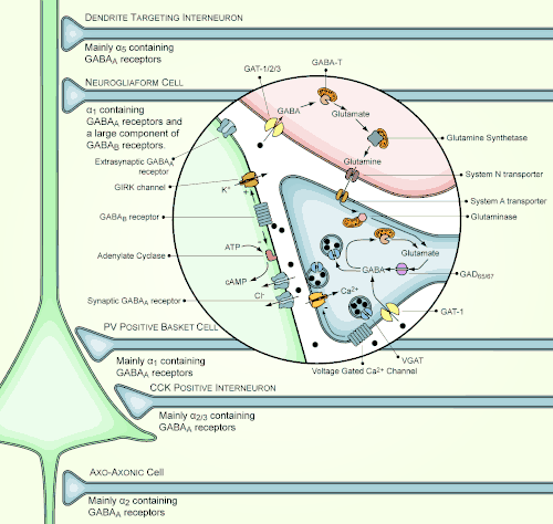 La producción, liberación, acción y degradación de GABA en una sinapsis GABAérgica