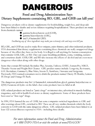 - ↑ Departamento de estado de EEUU. «GHB, GBL and 1,4BD as Date Rape Drugs» (en inglés). Consultado el 25 de diciembre de 2008.