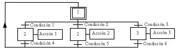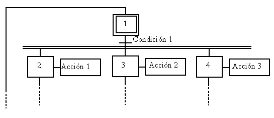 En las secuencias simultáneas varios ciclos pueden estar funcionando a la vez por activación simultánea de etapas. En el siguiente ejemplo, cuando se cumple la condición 1 las etapas 2, 3 y 4 se activan simultáneamente: