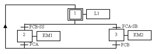 Al arrancar el programa se activa la etapa inicial 1 encendiéndose la lámpara de paro, L1. En el supuesto de que el montacargas esté en la planta baja, FCB = 1, la activación del pulsador de bajada, SB = 1, no tendrá ningún efecto. En cambio la activación del pulsador de subida, SS = 1, provocará la desactivación de la etapa 1 y la activación de la 2, ya que se cumple la condición de transición, esto es, el producto lógico de SS y FCB es 1. La activación de la etapa 2 excita el contactor KM1, y el montacargas sube. Al llegar a la planta alta, FCA = 1, se desactiva la etapa 2 y vuelve a activarse la 1, parándose el motor. En estas condiciones, la actuación sobre SS no tiene efecto alguno y sobre SB provoca la activación de KM2, lo que hace que el montacargas comience a bajar hasta activarse el detector de la planta baja, FCB = 1, momento en el que se parará.
