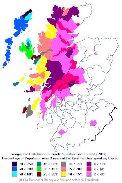 ![]() ![]() Distribución poblacional de los hablantes del Gaélico en Escocia (2001).