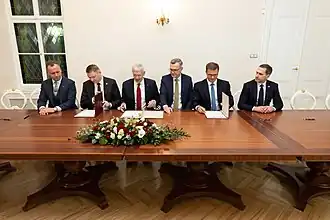 ![]() Firma del acuerdo de las fuerzas políticas representadas en la Saeima y que forman el gobierno: 'Nueva Unidad', 'Lista Unida' y 'Alianza Nacional' | |||||