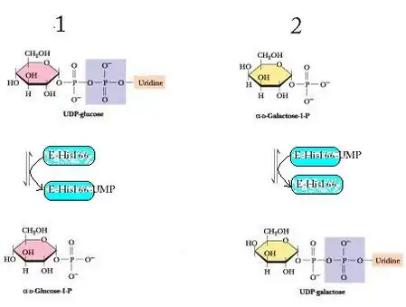 La galactosa-1-fosfato uridiltransferasa (GALT) cataliza la segunda reacción de la ruta de Leloir de metabolismo de la galactosa a través de una cinética enzimática bi bi ping pong con un mecanismo de doble desplazamiento.[4] Esto significa que la reacción neta consiste en dos reactantes y dos productos, y procede mediante el siguiente mecanismo: La enzima reacciona con un sustrato para generar un producto y la enzima modificada que posteriormente reacciona con el segundo sustrato para formar el segundo producto regenerándose la enzima original.[5] En el caso de GALT, el residuo His-166 actúa como un nucleófilo potente para facilitar la transferencia de un nucleótido entre UDP-hexosas y hexosa-1-fosfatos.[6]