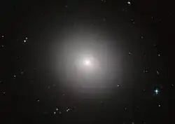 Una galaxia elíptica es un tipo de galaxia de la secuencia de Hubble caracterizada por tener una forma aproximadamente elipsoidal y apenas rasgos distintivos, careciendo por ejemplo de los brazos espirales que caracterizan a las galaxias homónimas. Son una de las cuatro principales clases de galaxias descritas por Edwin Hubble en el trabajo de 1936 The Realm of the Nebulae,[1] junto con las galaxias de espiral y lenticulares. Las galaxias elípticas (E) son, junto con las galaxias lenticulares (S0) con sus discos a gran escala, y las galaxias ES[2][3][4] con sus discos de escala intermedia, un subconjunto de la población de galaxias de "tipo temprano".