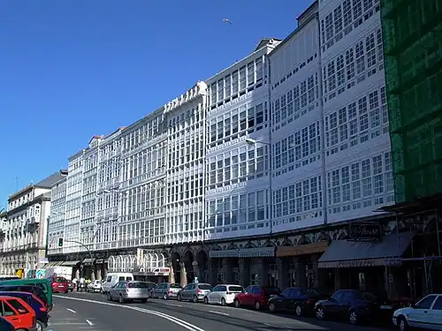 Las galerías de La Coruña son balcones cerrados con carpintería de madera pintada de blanco y con una gran superficie de vidrio que funcionan como miradores y que son características de las viviendas de la avenida de la Marina de La Coruña.