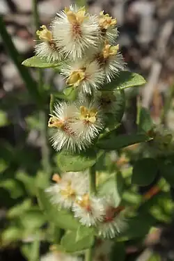 Es una hierba perenne cespitosa que forma parches verdes alfombrados entre las rocas de las laderas de las montañas. Sus tallos rastreros pueden alcanzar hasta unos 20 centímetros de largo. Las hojas están dispuestas, a intervalos en el tallo, en forma de verticilos de cuatro. Las hojas son ovaladas y puntiagudas, ligeramente carnosas y aterciopeladas. La planta es dioica, pero las flores masculinas y femeninas son similares en apariencia, con color amarillento a rojizo de las pequeñas corolas en los extremos de los tallos con hojas. El fruto es una nuez con una capa de pelos muy largos. Cuando aparece la fruta con un gran número de núculas, la planta adquiere un aspecto borroso.