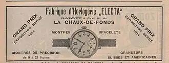 Charles Perret falleció en 1916,[5] y en 1920, George Wallace se convirtió en el nuevo socio de Gallet en los Estados Unidos.[6] La turbulenta era posterior a la Primera Guerra Mundial provocó el fin de la fabricación de los relojes Electa a mediados de la década de 1920. En ese momento, Gallet se concentró en el suministro de cronómetros, también conocidos como temporizadores, con las marcas no solo Gallet, sino también Galco y Guinand. Un artículo de la década de 1930 de The Jewelers' Circular señalaba que Gallet "importa la mayor parte de los temporizadores utilizados en este país [EE. UU.]",[7] lo que destaca la relevancia de las operaciones de Gallet en Estados Unidos. El enfoque de la compañía en los temporizadores en las décadas de 1920 y 1930 fue probablemente una sabia decisión comercial, ya que el margen de beneficio de un cronómetro a veces era "más alto que el de un reloj promedio, pero ciertamente nunca menos".[7]