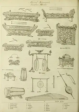 Varios instrumentos musicales javaneses en Gamelan Salindro, La historia de Java de Thomas Stamford Raffles (1781-1826)