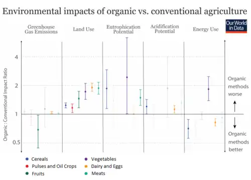 Un metaanálisis de 2021 informó (i) una productividad 14% menor en vacas lecheras orgánicas, (ii) una eficiencia del uso de alimento 11% y 89% menor en vacas lecheras y pollos orgánicos de engorde, respectivamente, y (iii) una menor competencia entre el uso de cultivos para alimentación animal y humana en sistemas lecheros orgánicos.[7]