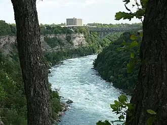El río Niágara fluyendo a través de la Garganta del Niágara (desde el salto situado al este, hacia el norte del Remolino del Niágara). | ||