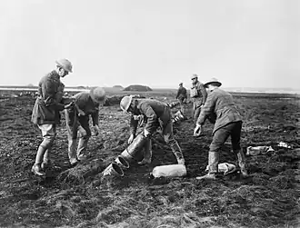- "murieron 90 hombres por envenenamiento por gas en las trincheras; de los 207 trasladados a las salas de vendaje, 46 murieron casi de inmediato y 12 tras largo sufrimiento."