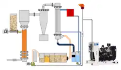 - Electricidad: Por medio de motores alternativos, turbinas de gas, turbinas de vapor, cogeneración, gasificación integrada en ciclo combinado - GICC y pilas de combustible, en la que el combustible es el hidrógeno obtenido a partir del gas generado en la gasificación.