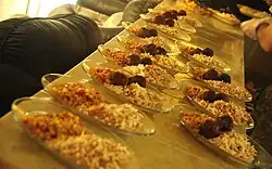 La gastronomía de Afganistán ( Dari : آشپزی افغانستان , Pashto : افغان پخلی ) se basa principalmente en los principales cultivos del país: trigo, maíz, cebada y arroz. Estos alimentos básicos acompañan a frutas, verduras y productos lácteos autóctonos como leche, yogur y suero de leche.[1] Las especialidades culinarias de la nación reflejan su diversidad étnica y geográfica. Afganistán es conocido por sus granadas, uvas de alta calidad y melones dulces con forma de fútbol de rugby.[2] Su plato nacional es la pala de Kabuli.[3]