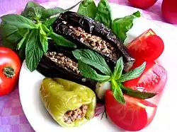 El “badımchán dolmasí” se elabora rellenando las berenjenas, los tomates, o los pimientos con carne picada, arroz y albahaca.