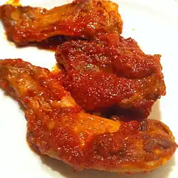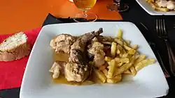 La cocina de Aragón tiene un origen rural y pastoril, como indica la sencillez de sus platos.[46] La parte central de Aragón, la más llana, es la más rica en especialidades culinarias. Al ser tierra de corderos criados en las laderas de los Pirineos, uno de sus platos más afamados es el asado de ternasco (acompañado tan solo de ajo, sal y grasa de tocino), existiendo el cordero a la pastora (guiso en cazuela de cordero y patatas), las cabezas de cordero al horno y los espárragos montañeses (son las colas de las corderas dedicadas a la cría). Los platos de cerdo son populares, teniéndose las magras con tomate, las piernas de cerdo asadas y las almojábanas. Un plato muy conocido es el pollo al chilindrón, preparado también con cordero. Son platos de origen pastoril aragonés las denominadas migas de pastor y el recao de Binéfar (mezcla de judías blancas, arroz y patatas).[47] En común con otras regiones españolas, son famosos los chilindrones de pollo y cordero. Son conocidas las migas pastoriles, siendo particulares entre ellas las migas con chocolate (de influencia navarra), con tropezones, turolenses, etcétera. Entre las recetas con pan destacan las sopas tostadas y los galianos, además de los regañaos (tortas con una sardina o arenque «incrustado») y la goguera (especie de empanada originaria de Barbastro). Entre las salsas se encuentra el ajo-aceite.
