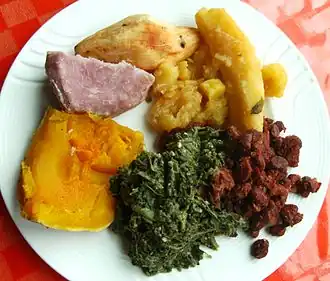 El ugali (o bugali) es una papilla hecha con harina de maíz o yuca y agua que se consume en todo el este de África.[4] El isombe se elabora a partir de hojas de yuca machacadas y se sirve con pescado seco. Matooke es un plato elaborado a base de plátano cocinado al horno o al vapor. La ibihaza se elabora con calabazas picadas, mezcladas con frijoles y luego hervidas. La pasta de maní llamada ikinyiga y la pasta de mijo llamada umustima w'uburo están hechas de agua hervida y harina.[5]