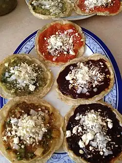 - ↑ «Picadas {México}, tortillitas de maíz con las orillas pellizcadas cubiertas de salsas, cebolla y queso». Golosos del Mundo. 5 de septiembre de 2017. Consultado el 27 de agosto de 2020.