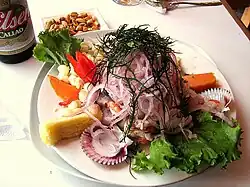 La gastronomía peruana es el conjunto de platillos y técnicas culinarias del Perú que forman parte de las tradiciones y vida común de sus habitantes, resultado de su herencia ancestral, biodiversidad y fusión de la tradición culinaria y milenaria del antiguo Perú con la gastronomía europea, asiática entre otras, lo que la convierte en una de las gastronomías más sofisticadas del mundo.[1]​ En 2011, la gastronomía peruana fue reconocida como «Patrimonio Cultural de las Américas para el Mundo» por parte de la Organización de los Estados Americanos[2]​ y en 2023 la Unesco reconoció al ceviche como expresión de la cocina tradicional peruana y patrimonio cultural inmaterial de la humanidad.[3][4]
