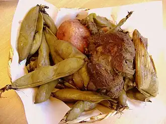 • Maíz: Existen 50 ecotipos,[52]​ compartiendo el origen con toda América Central, llegó a Europa primitivamente como suplemento para la alimentación del ganado y luego de diversas formas y modos se hizo indispensable en las mesas del mundo. Las variedades utilizadas en Europa y la mayor parte del mundo, sin embargo, son de Centroamérica. El maíz del Perú de granos muy grandes es componente de numerosos platos tradicionales, además una variedad: el maíz morado, es único en el mundo.[53]