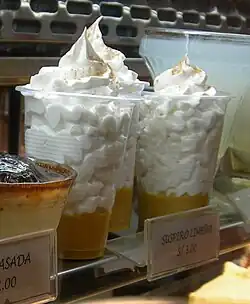 • Suspiro de limeña: Es un antiguo postre limeño consistente en una capa de manjarblanco de yemas, cubierto por un merengue fresco y suelto elaborado con Oporto (vino dulce) y espolvoreado con canela. Se suele servir en copa.
