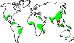 - El plátano o banana, la fruta más producida y consumida del mundo. Originaria del Sudeste Asiático, donde hace 10.000 años ya se cultivaba.[56]
