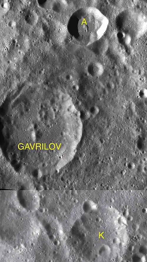 Por convención estas características son identificadas en mapas lunares poniendo la letra en el lado del cráter punto medio que está más cerca de Gavrilov.