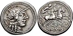 ![]() Denario romano del 123 a. C. con la inscripción C · CATO. | ||