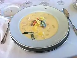 El gazpachuelo es una sopa caliente originaria de Málaga y típica de pescadores,[1] consistente en un caldo de pescado y mahonesa a base de yema de huevo y aceite de oliva, cuando la mahonesa se hacía a mano y actualmente se la añade también la clara. Se acompañaba de la clara del huevo duro cortado en pequeños taquitos, gambas, así como de patatas cocidas o arroz y en algunos pueblos de rebanaditas de pan tostado.