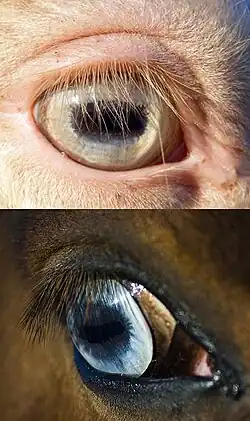 - ↑ a b Locke, MM; LS Ruth, LV Millon, MCT Penedo, JC Murray, AT Bowling (2001). «The cream Dilution general, responsible for the palomino and Buckskin coat colores, maps to horse chromosome 21». Animal Genetics 32 (6): 340-343. PMID 11736803. doi:10.1046/j.1365-2052.2001.00806.x. «The eyes and skin of palominos and buckskins are often slightly lighter than their non-dilute equivalentes.»