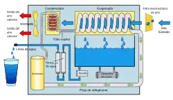 En un generador de agua atmosférica del tipo de condensación por enfriamiento, un compresor circula refrigerante a través de un condensador y a través de un serpentín o bobina evaporadora la cual enfría el aire que lo rodea. Esto baja la temperatura de aire a su punto de rocío, causando que el agua se condense. Un ventilador de velocidad controlada empuja el aire filtrado sobre la bobina. El agua resultante es entonces pasada a un tanque de almacenamiento con sistemas de purificación y filtración para ayudar a mantener el agua pura y reducir el riesgo provocado por virus y bacterias los cuales pueden ser recogidos del aire ambiental en el evaporador de bobina por el agua de la condensación.[5]