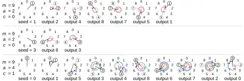 - ↑ "Linear Congruential Generators" por Joe Bolte, Wolfram Demonstrations Project.