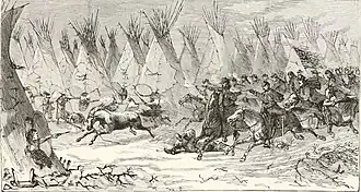 La masacre de Sand Creek de 1864, que causó indignación en su época, ha sido considerada un genocidio. El coronel John Chivington dirigió una fuerza de 700 hombres de la milicia del Territorio de Colorado en una masacre de 70 a 163 pacíficos cheyenne y arapaho, aproximadamente dos tercios de los cuales eran mujeres, niños y bebés. Chivington y sus hombres tomaron cueros cabelludos y otras partes del cuerpo como trofeos, incluidos fetos humanos y genitales masculinos y femeninos.[98] Chivington declaró: «¡Maldito sea cualquier hombre que simpatice con los indios!... He venido a matar indios, y creo que es correcto y honorable utilizar cualquier medio bajo el cielo de Dios para matar indios... Matar y arrancar el cuero cabelludo a todos, grandes y pequeños; las liendres producen piojos».[99]