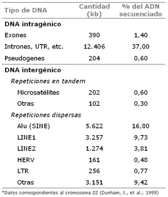 El genoma humano presenta una densidad de genes muy inferior a la que inicialmente se había predicho, con solo 1.5 %[2] de su longitud compuesta por exones codificantes de proteínas. Un 70 % está compuesto por ADN extragénico y un 30% por secuencias relacionadas con genes. Del total de ADN extragénico, aproximadamente un 70 % corresponde a repeticiones dispersas, de manera que, más o menos, la mitad del genoma humano corresponde a secuencias repetitivas de ADN. Por su parte, del total de ADN relacionado con genes se estima que el 95 % corresponde a ADN no codificante: pseudogenes, fragmentos de genes, intrones o secuencias UTR, entre otros.