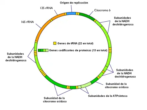 - 13 genes codificantes de proteínas: codifican 13 polipéptidos que forman parte de los complejos multienzimáticos de la fosforilación oxidativa (sistema OXPHOS). Son 7 subunidades del Complejo I (NADH deshidrogenasa), una subunidad del complejo III (citocromo b), 3 subunidades del complejo IV (citocromo oxidasa) y 2 subunidades del Complejo V (ATPsintasa).