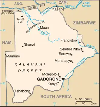 Botsuana limita al norte con Zambia, al este con Zimbabue, al sur con Sudáfrica y al oeste y al norte con Namibia. El país está dominado en gran medida por el desierto del Kalahari, el desierto más meridional de África, que domina en especial el sudoeste del país.[1]