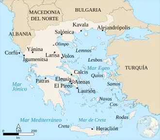 Grecia (en griego Ελλάδα) es un estado de Europa meridional, miembro de la Unión Europea (UE) situado en el extremo sur de la península balcánica en el litoral del mar Mediterráneo. Limita con el Mar Egeo, el Jónico y el Mediterráneo, entre Albania y Turquía. Grecia tiene frontera por tierra con Albania, Macedonia del Norte, Bulgaria y Turquía. Por mar hace frontera con Italia, Turquía y Albania.