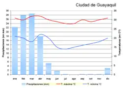 El clima de Guayaquil es el resultado de la combinación de varios factores. Por su ubicación en plena zona ecuatorial, la ciudad tiene una temperatura cálida durante casi todo el año. No obstante, su proximidad al Océano Pacífico hace que las corrientes de Humboldt (fría) y de El Niño (cálida) marquen dos períodos climáticos bien diferenciados. Uno lluvioso y húmedo, con calor típico del trópico, que se extiende diciembre a abril (conocido como invierno que corresponde al verano austral); y el otro seco y un poco más fresco (conocido como verano que corresponde al invierno austral), que va desde mayo a diciembre.[9]