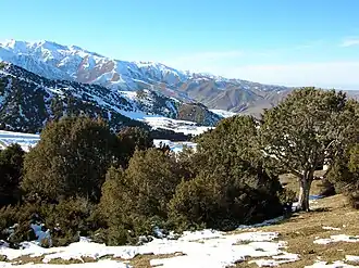 Al oeste hay una gran depresión, el valle de Fergana. Al este, en el extremo nororiental, dos brazos del Tian Shan, las cordilleras de Kungey-Alatau y Terskey-Alatau (el Alatau kirguís) encierran el lago Issyk-Kul.[4] El valle de Fergana está separado de las altas mesetas alpinas centrales y orientales por las montañas de Fergana, que van de sudeste a noroeste, y la cordillera de Chatkal, que culmina a 4.503 m.
