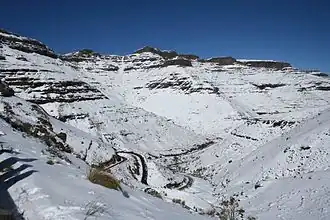 La precipitación anual varía entre alrededor de 600 milímetros en los valles de las Tierras Bajas y alrededor de 1.200 milímetros en las zonas del Norte y el Este, en el escarpe limítrofe con Sudáfrica.[9][13] La mayoría de las lluvias ocurren en forma de tormentas de verano: el 85% de la precipitación anual cae entre los meses de octubre y abril.[13] Los inviernos —entre mayo y septiembre— son por lo general relativamente secos y rigurosos.[13] La nieve es común en los desiertos y valles bajos entre mayo y septiembre; en los picos más altos se puede experimentar la caída de nieve durante todo el año.[1] Hay mucha diferencia anual en las cantidades de lluvia, lo que da lugar a sequías periódicas.