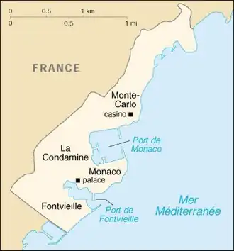 No hay divisiones administrativas formalmente constituidas, pero sí se pueden distinguir cuatro barrios (quartiers, singular - quartier): Fontvieille, La Condamine, Monaco-Ville y Montecarlo. La capital es Monaco-Ville, con 1.034 habitantes (2000), que se alza sobre un pequeño acantilado; en ella se encuentran el Palacio del Príncipe y el Museo Oceanográfico. Montecarlo queda al este de Monaco-Ville, es un barrio residencial de 3.034 habitantes (2000), estación turística y climática, y allí se encuentra un famoso Casino (1868) y el circuito de Fórmula 1. En La Condamine, de 3.847 habitantes (2000) se encuentran el puerto y la industria (de artesanía, productos de precisión y editorial). Fontvieille, con 3.292 habitantes (2000), es el más nuevo de los distritos del principado, construido recientemente sobre unos terrenos ganados al Mediterráneo durante los años setenta; allí está el Estadio de fútbol Luis II.
