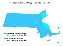 Massachusetts tiene un clima continental húmedo. Los veranos son cálidos, mientras que los inviernos son relativamente fríos, con temperaturas promedio de enero por debajo de cero en la mayor parte del estado.
