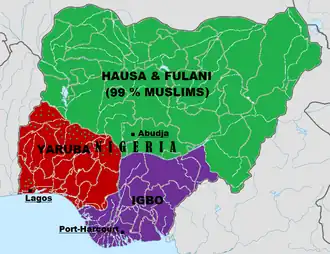 Según el Proyecto Joshua,[13] una organización que intenta implantar el cristianismo evangélico en todos los grupos étnicos del mundo, en Nigeria hay 539 grupos étnicos, de los cuales una quincena superan el millón de miembros, entre ellos, los anaang (2,7 millones); berom (1,25 millones); ebira (2 millones); edo o bini (1,9 millones); una rama de los fulani llamada adamawa (1,47 millones) que adoptó el islam en el siglo XIX, y de los que hay otros 2,4 millones en Camerún;[14][15] gbagyi (1,2 millones); ibibio (5,8 millones); ijaw (2,3 millones); igala (1,5 millones); kanuri (7 millones); nupe (1,7 millones); tiv (4,3 millones), y urhobo (1 millón).