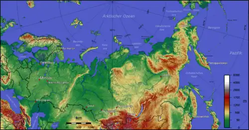 Las cordilleras rusas se encuentran principalmente a lo largo de su división continental (los montes Urales). A lo largo de la frontera suroeste (el Cáucaso), a lo largo de la frontera con Mongolia (la parte oriental y occidental de las montes Sayanes, y el extremo occidental del macizo de Altái), y en la parte oriental de Siberia (un complejo sistema de cordilleras en la esquina noreste del país que forman la columna vertebral de la península de Kamchatka, y, en menor extensión, las montañas a lo largo del mar de Ojotsk y el mar de Japón). Rusia tiene nueve grandes cadenas montañosas. En general, la mitad oriental del país es mucho más montañosa que la mitad occidental, cuyo interior está dominado por las llanuras bajas. La tradicional línea divisoria entre el este y el oeste es el valle del río Yeniséi. Delineando la frontera occidental de la meseta Central de Siberia de la llanura de Siberia Occidental, el Yeniséi se extiende desde cerca de la frontera mongola hasta el norte, en el océano Ártico, al oeste de la península de Taymyr.
