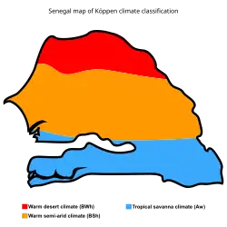 El clima de Senegal es tropical, cálido y húmedo, con una estación seca de noviembre a mayo, y una estación húmeda de mediados de junio a mediados de octubre, a causa del monzón africano, que desplaza los vientos de sur a norte siguiendo la perpendicular del sol. La lluvia es más abundante en el sur (600 a 1500 mm), mientras que en el norte es inferior a 600 mm.